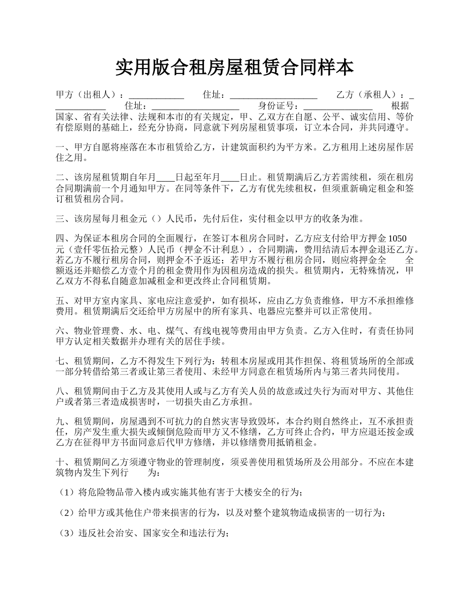 实用版合租房屋租赁合同样本甲方(出租人):____________住址:___________________乙方(承租人):____________住址:___________________身份证号:_______________根据国家、省有关法律、法规和本市的有关规...