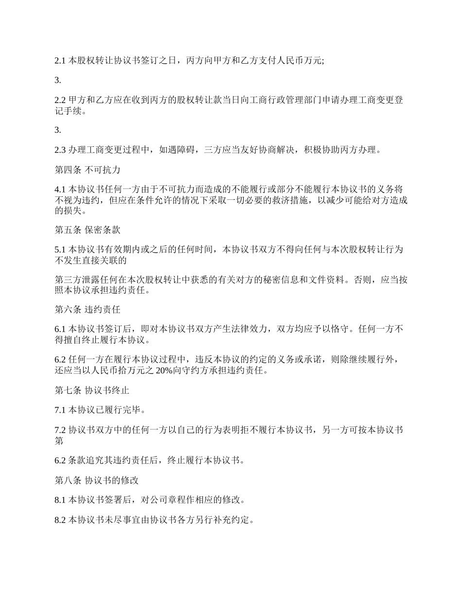 三方股权转让热门合同样书甲方:身份证号码:乙方:身份证号码:丙方:身份证号码:第一条鉴于条款1.1甲方与乙方分别合法拥有上海XX公司(以下简称目标公司)%及%股权。现经俩股东决定,将全部股权转让给丙方,由丙...