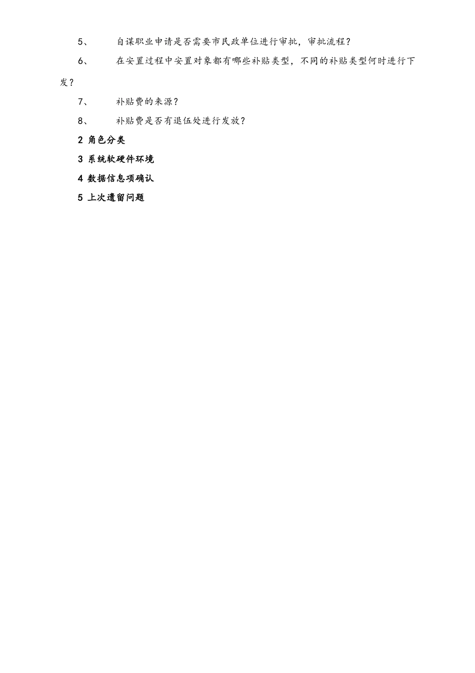 【安置接收管理】项目调研提纲1问题列表1.1军队离退休干部接收安置1、军队离退休干部安置的对象?2、军队离退休干部安置大概在每年的那几个月份?3、每年就安置军退离退休干部计划的下达过程?4、下达的安置计划中...