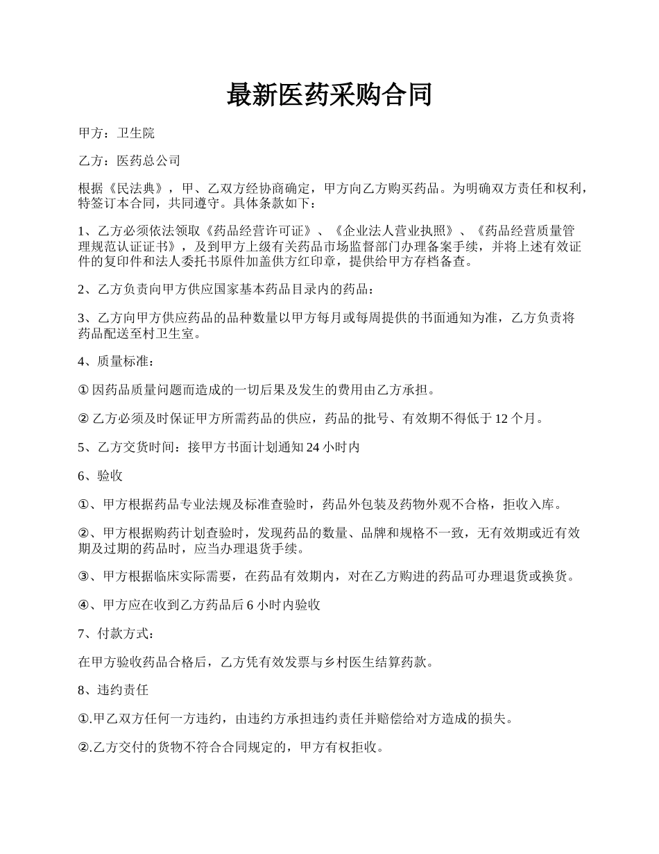 最新医药采购合同甲方:卫生院乙方:医药总公司根据《民法典》,甲、乙双方经协商确定,甲方向乙方购买药品。为明确双方责任和权利,特签订本合同,共同遵守。具体条款如下:1、乙方必须依法领取《药品经营许可证...