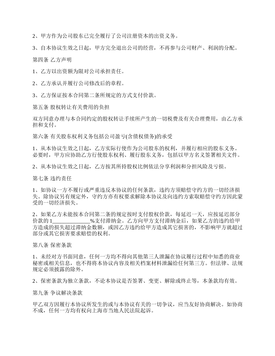 通用版个人股权转让协议转让方:__________________(以下简称甲方)身份证:__________________地址:__________________受让方:__________________(以下简称乙方)身份证:__________________地址:_____________...