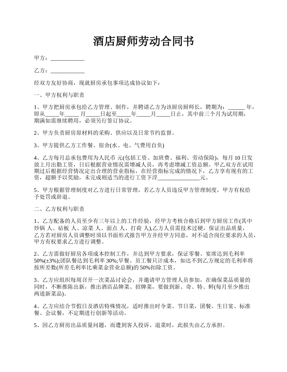 酒店厨师劳动合同书甲方:____________乙方:____________经双方友好协商,现就厨房承包事项达成协议如下:一、甲方权利与职责1、甲方把厨房承包给乙方管理、制作,并聘请乙方为该厨房厨师长,聘期为:______年,...