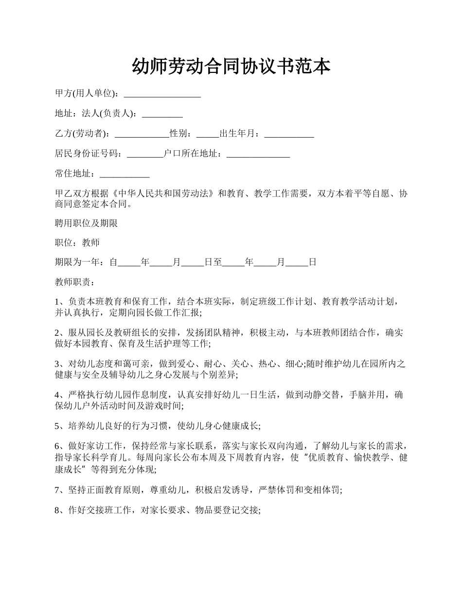 幼师劳动合同协议书范本甲方(用人单位):_________________地址:法人(负责人):_________乙方(劳动者):____________性别:_____出生年月:___________居民身份证号码:________户口所在地址:______________常...