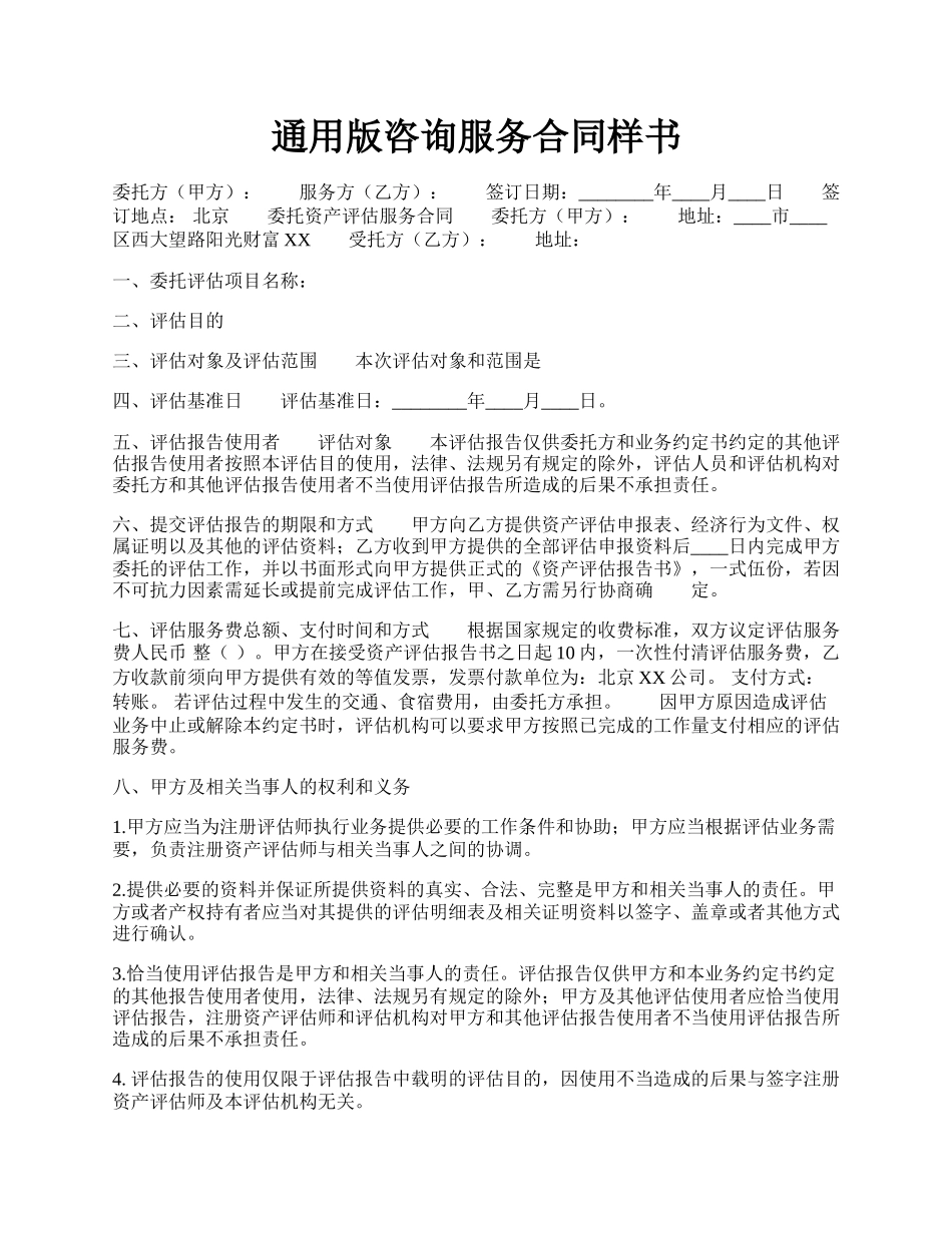 通用版咨询服务合同样书委托方(甲方):服务方(乙方):签订日期:________年____月____日签订地点:北京委托资产评估服务合同委托方(甲方):地址:____市____区西大望路阳光财富XX受托方(乙方):地址:一...