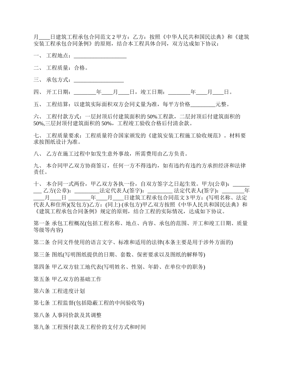 建筑工程承包合同样板通用版一个建筑企业在社会中从事经济活动的前提是:要有一份建筑工程承包合同。建筑工程承包合同是怎样的呢以下是华律网小编为大家整理的建筑工程承包合同范文,欢迎参考阅读。建筑工程承包合...