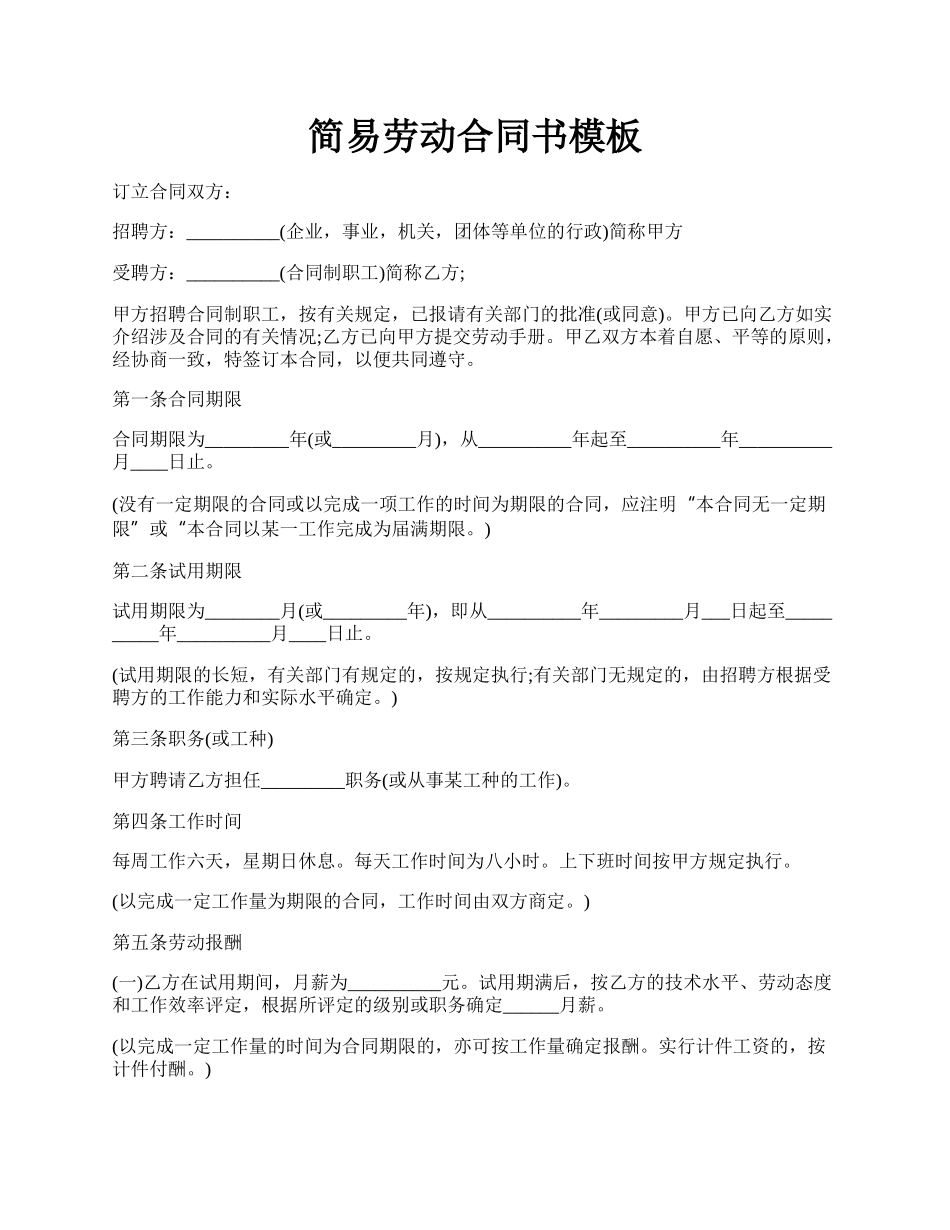 简易劳动合同书模板.docx