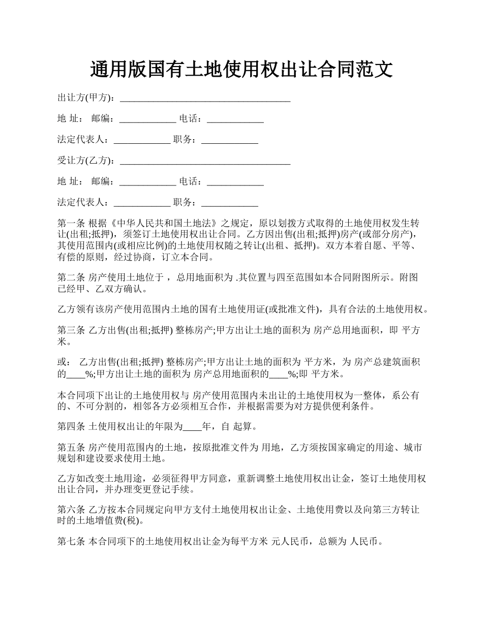 通用版国有土地使用权出让合同范文出让方(甲方):____________________________________地址:邮编:____________电话:____________法定代表人:____________职务:____________受让方(乙方):_________________...