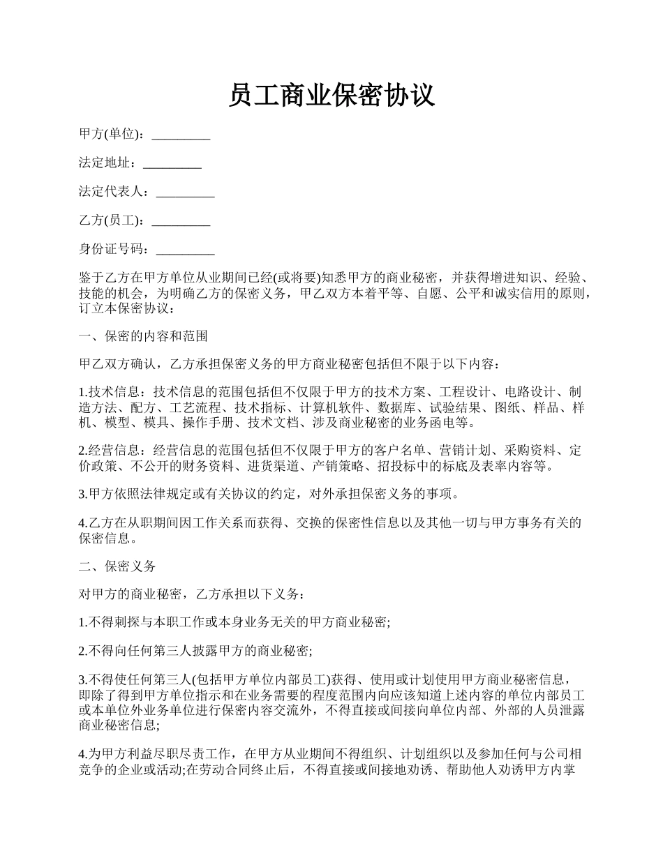 员工商业保密协议甲方(单位):_________法定地址:_________法定代表人:_________乙方(员工):_________身份证号码:_________鉴于乙方在甲方单位从业期间已经(或将要)知悉甲方的商业秘密,并获得增进知识、经验...