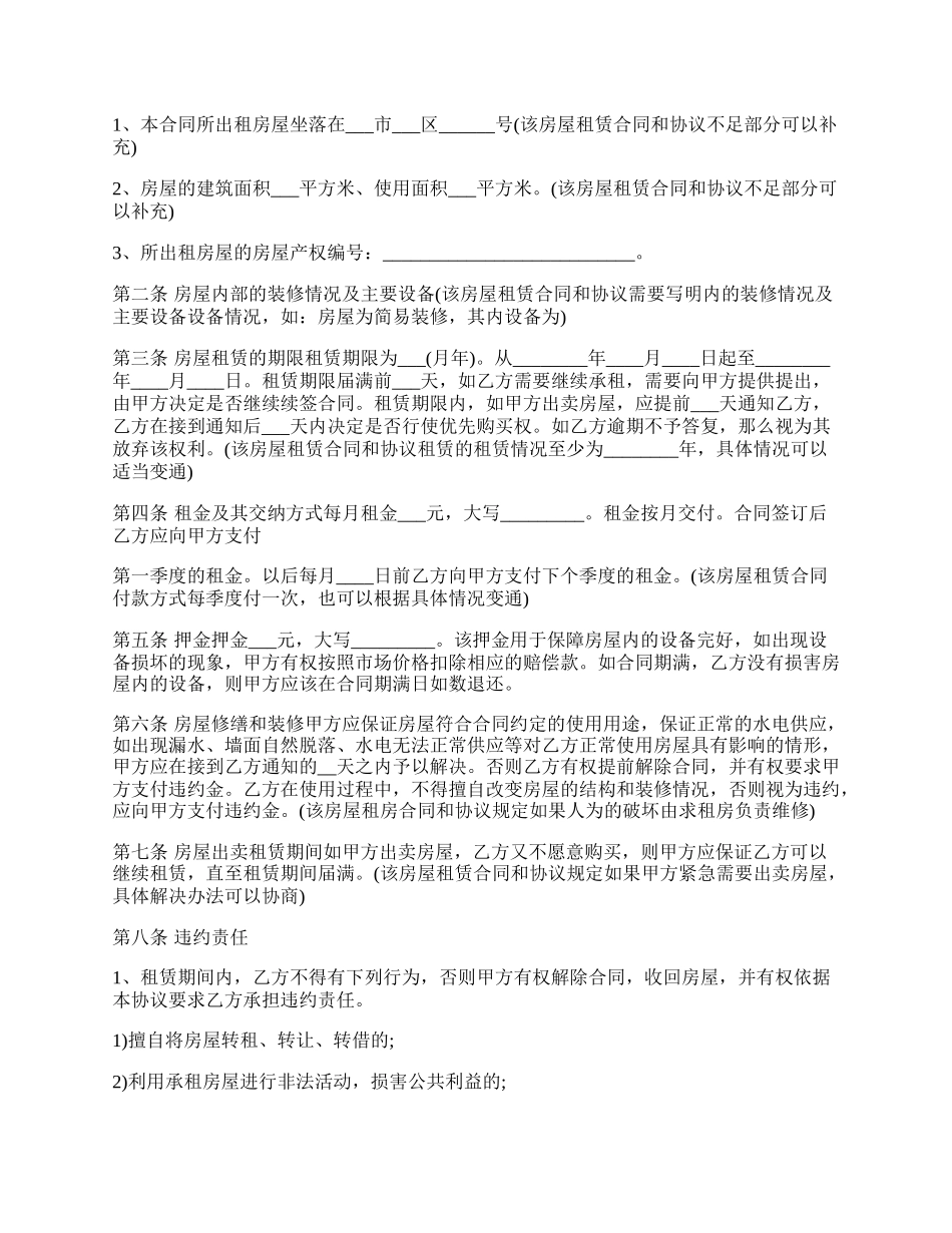 简易租房合同通用版出租人(以下简称甲方)__________________承租人(以下简称乙方)__________________甲、乙双方当事人经充分协商,达成房屋租赁合同如下:一、该房屋位于_____________________________,房型____...