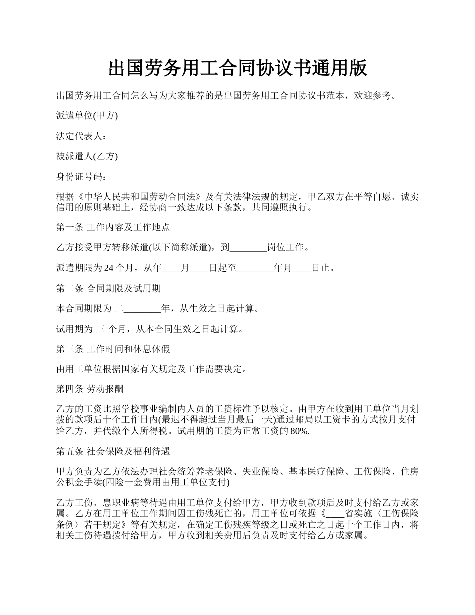 出国劳务用工合同协议书通用版出国劳务用工合同怎么写为大家推荐的是出国劳务用工合同协议书范本,欢迎参考。派遣单位(甲方)法定代表人:被派遣人(乙方)身份证号码:根据《中华人民共和国劳动合同法》及有关法律...