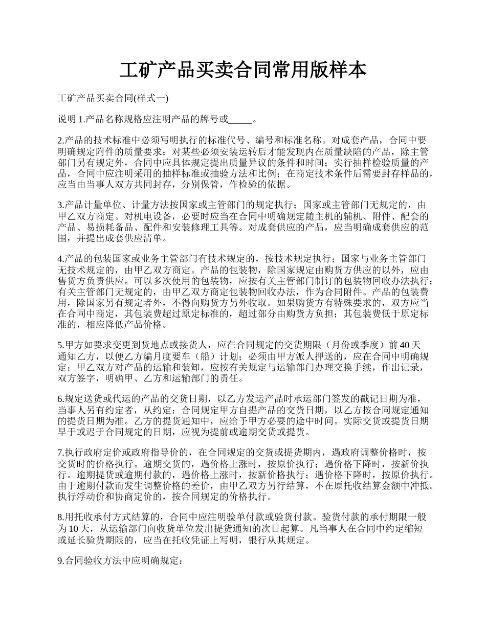 工矿产品买卖合同常用版样本工矿产品买卖合同(样式一)说明1.产品名称规格应注明产品的牌号或_____。2.产品的技术标准中必须写明执行的标准代号、编号和标准名称。对成套产品,合同中要明确规定附件的质量要求;对...