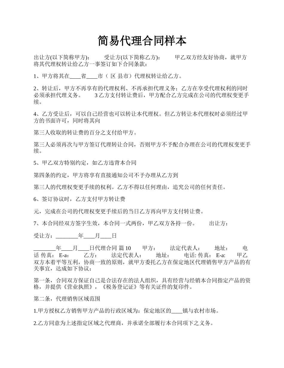 简易代理合同样本出让方(以下简称甲方):受让方(以下简称乙方):甲乙双方经友好协商,就甲方将其代理权转让给乙方一事签订如下合同条款:1、甲方将其在____省____市(区县市)代理权转让给乙方。2、转让后,甲方...