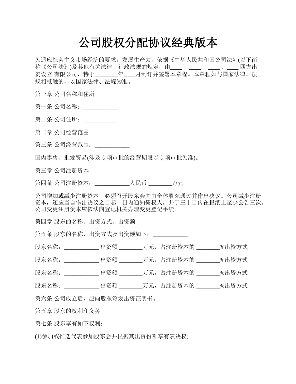 公司股权分配协议经典版本为适应社会主义市场经济的要求,发展生产力,依据《中华人民共和国公司法》(以下简称《公司法》)及其他有关法律、行政法规的规定,由____、____、____、____四方出资设立有限公司,特于_...