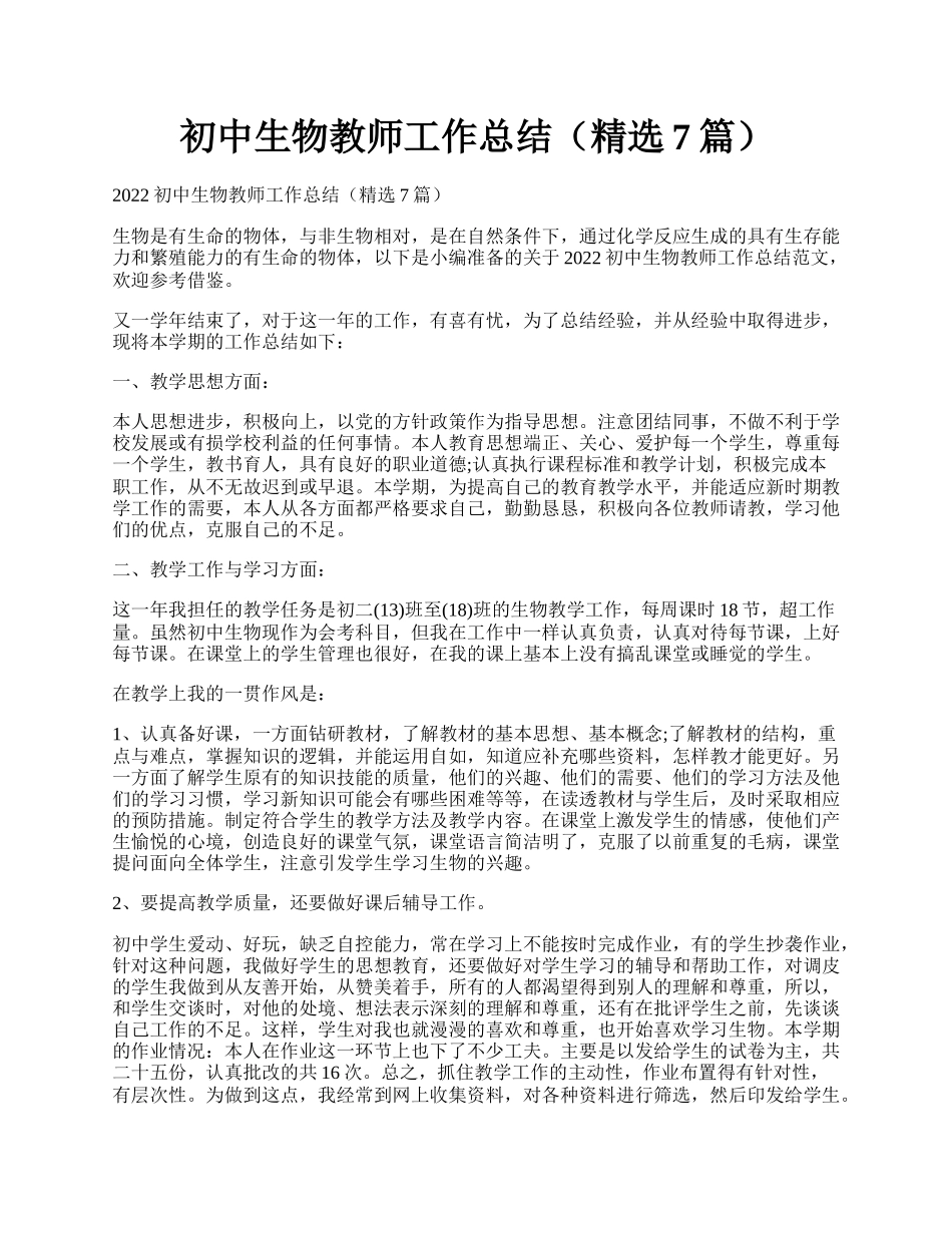 初中生物教师工作总结(精选7篇).docx_第1页