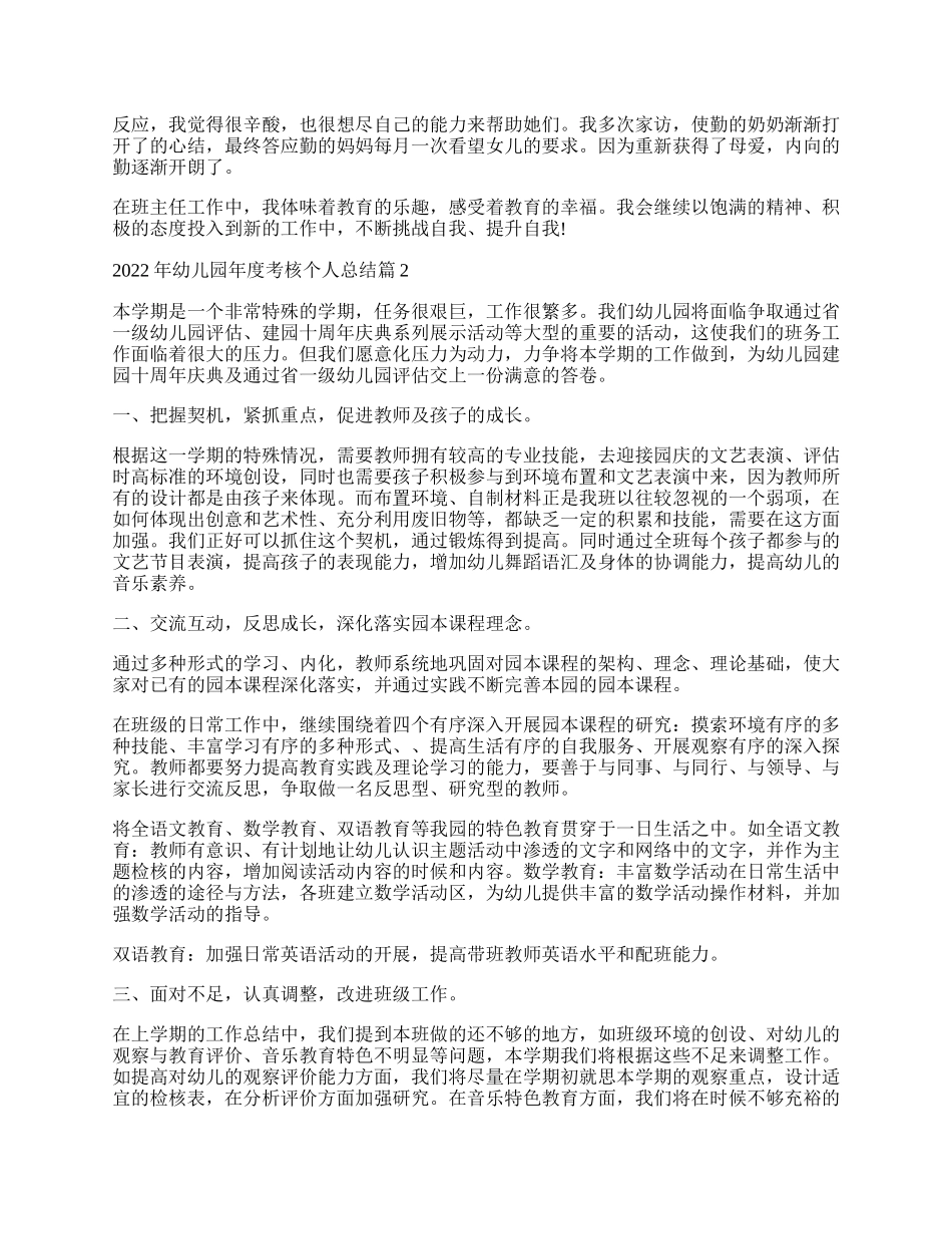 年幼儿园年度考核个人总结幼儿园是培养孩子的地方,每位幼儿园的工作人员都要尽心尽力尽责的去完成自己的本职工作,有到了该总结的时候了,下面小编为大家收集整理了“2022年幼儿园年度考核个人总结”,欢迎阅读...