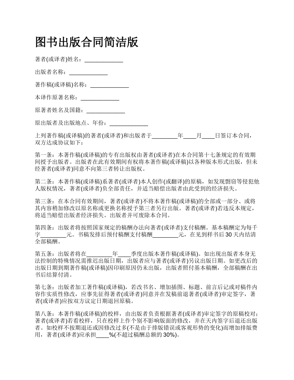 图书出版合同简洁版著者(或译者)姓名:____________出版者名称:____________著作稿(或译稿)名称:____________本译作原著名称:____________原著者姓名及国籍:____________原出版者及出版地点、年份:_________...