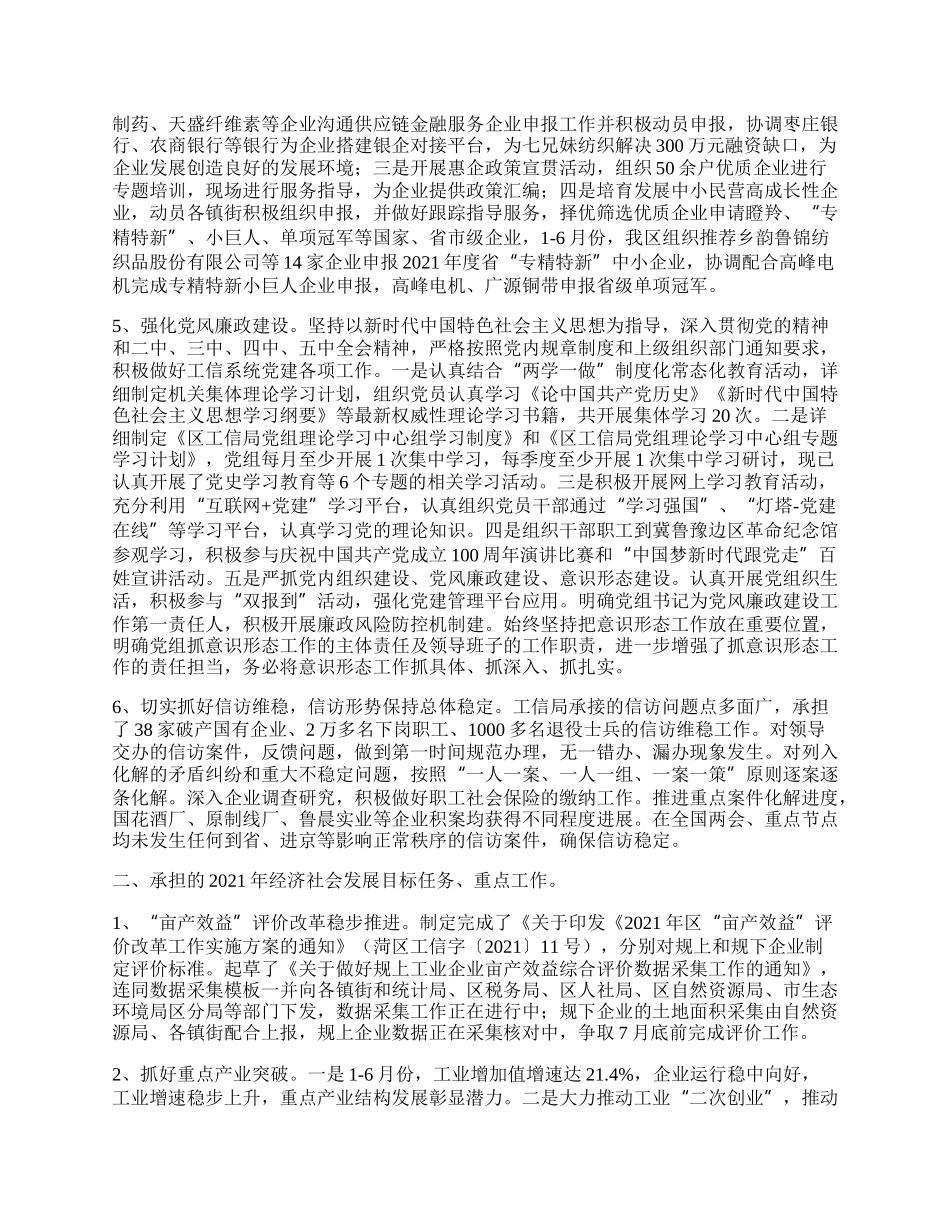 工信局上年工作总结及下年工作计划今年以来,区工信局在区委区政府的正确领导下,紧紧围绕“争先进位,走在前列”发展目标,精心部署、统筹谋划,加快推进重点产业转型升级,实施重点产业突破,完善综合协调服务...
