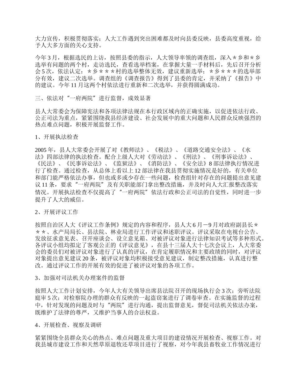 人大工作总结**县人大常委会2005年工作总结2005年,**县人大常委会在县委的领导下,以“三个代表”重要思想为指导,认真贯彻落实党的十六届四、五中全会、中发(2005)9号文件、自治区党委六届十次全委(扩大...