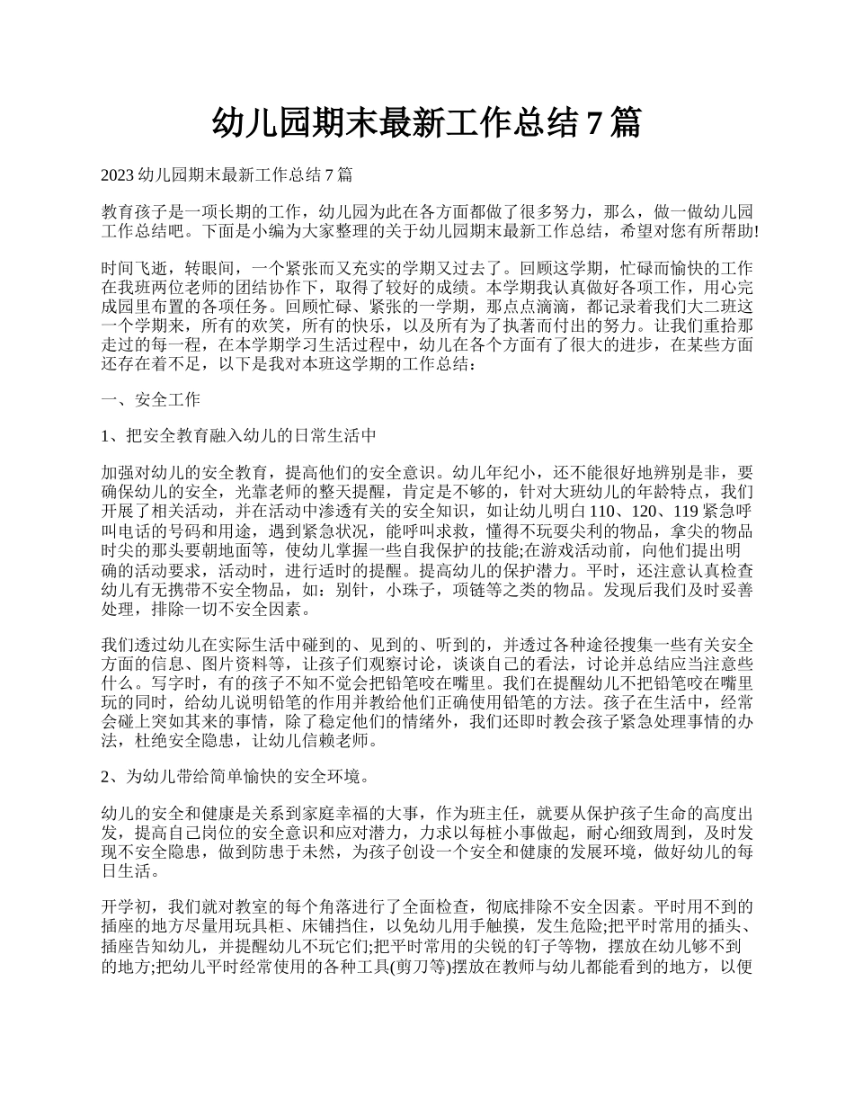 幼儿园期末最新工作总结7篇2023幼儿园期末最新工作总结7篇教育孩子是一项长期的工作,幼儿园为此在各方面都做了很多努力,那么,做一做幼儿园工作总结吧。下面是小编为大家整理的关于幼儿园期末最新工作总结,希...