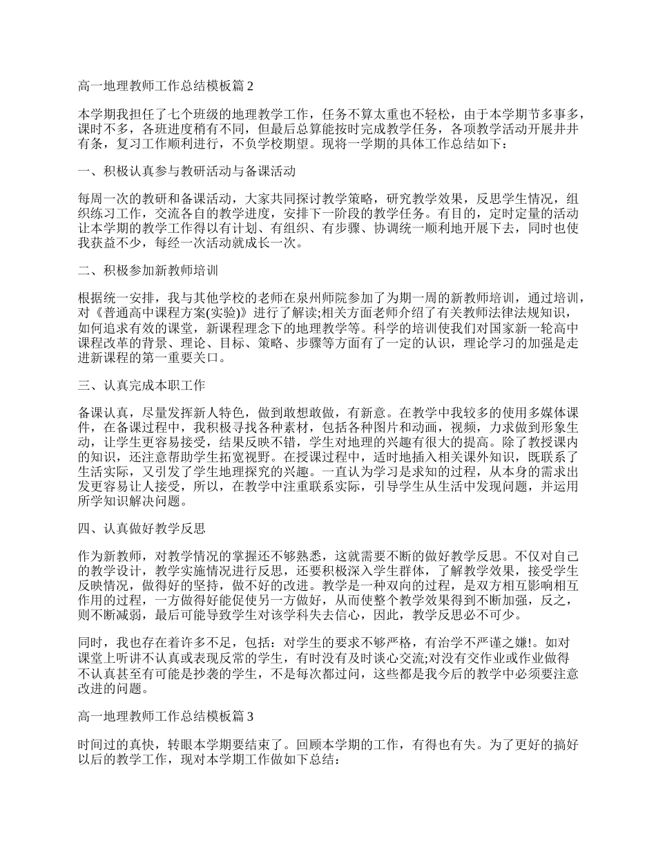 高一地理教师工作总结模板(15篇)地理学是研究地球表面的地理环境中各种自然现象和人文现象,以及它们之间相互关系的学科。地理是一门综合性的基础学科。以下是小编准备的高一地理教师工作总结,欢迎借鉴学习。...