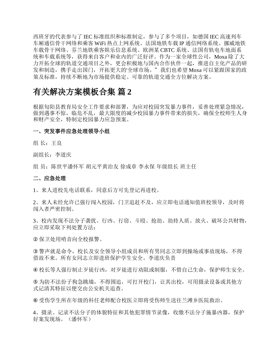 有关解决方案模板合集有关解决方案模板合集(通用34篇)有关解决方案模板合集篇1Moxa一直是基于IP通信网络解决方案的技术领先者。如今,Moxa不仅为铁路行业提供专业的网络知识和创新技术,还成为IEC铁路委员会的...