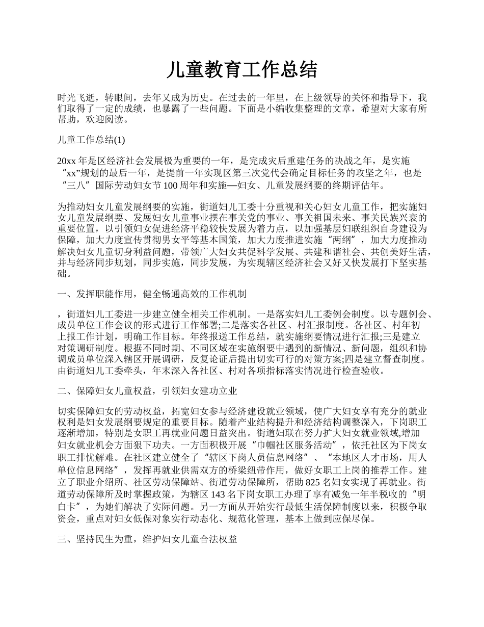 儿童教育工作总结时光飞逝,转眼间,去年又成为历史。在过去的一年里,在上级领导的关怀和指导下,我们取得了一定的成绩,也暴露了一些问题。下面是小编收集整理的文章,希望对大家有所帮助,欢迎阅读。儿童工作...