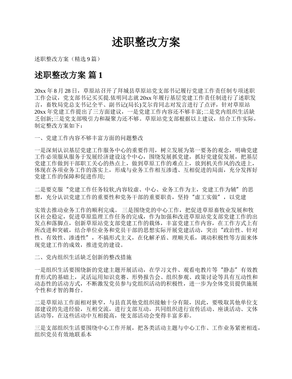 述职整改方案述职整改方案(精选9篇)述职整改方案篇120xx年8月28日,草原站召开了拜城县草原站党支部书记履行党建工作责任制专项述职工作会议,党支部书记买买提.依明同志就20xx年履行基层党建工作责任制进行了...