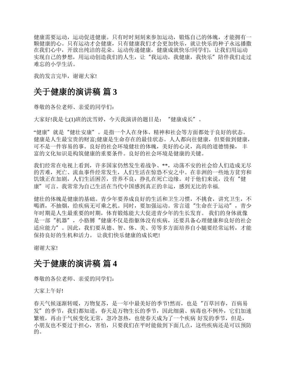 关于健康的演讲稿关于健康的演讲稿(精选28篇)关于健康的演讲稿篇1各位尊敬的评委,各位领导,各位亲爱的叔叔阿姨和各位同仁们,上午好!欢迎您来到自然健康之路的特别节目——小廖谈健康的直播现场,我是主讲人...