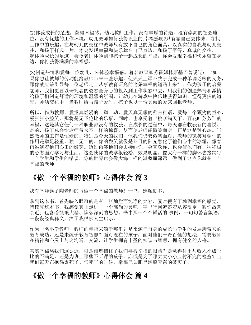 《做一个幸福的教师》心得体会《做一个幸福的教师》心得体会(通用31篇)《做一个幸福的教师》心得体会篇1随着现代进程的化步伐加快,社会竞争的日益激烈,现代人的工作压力也越来越大。特别是教师这一个职业,怎...