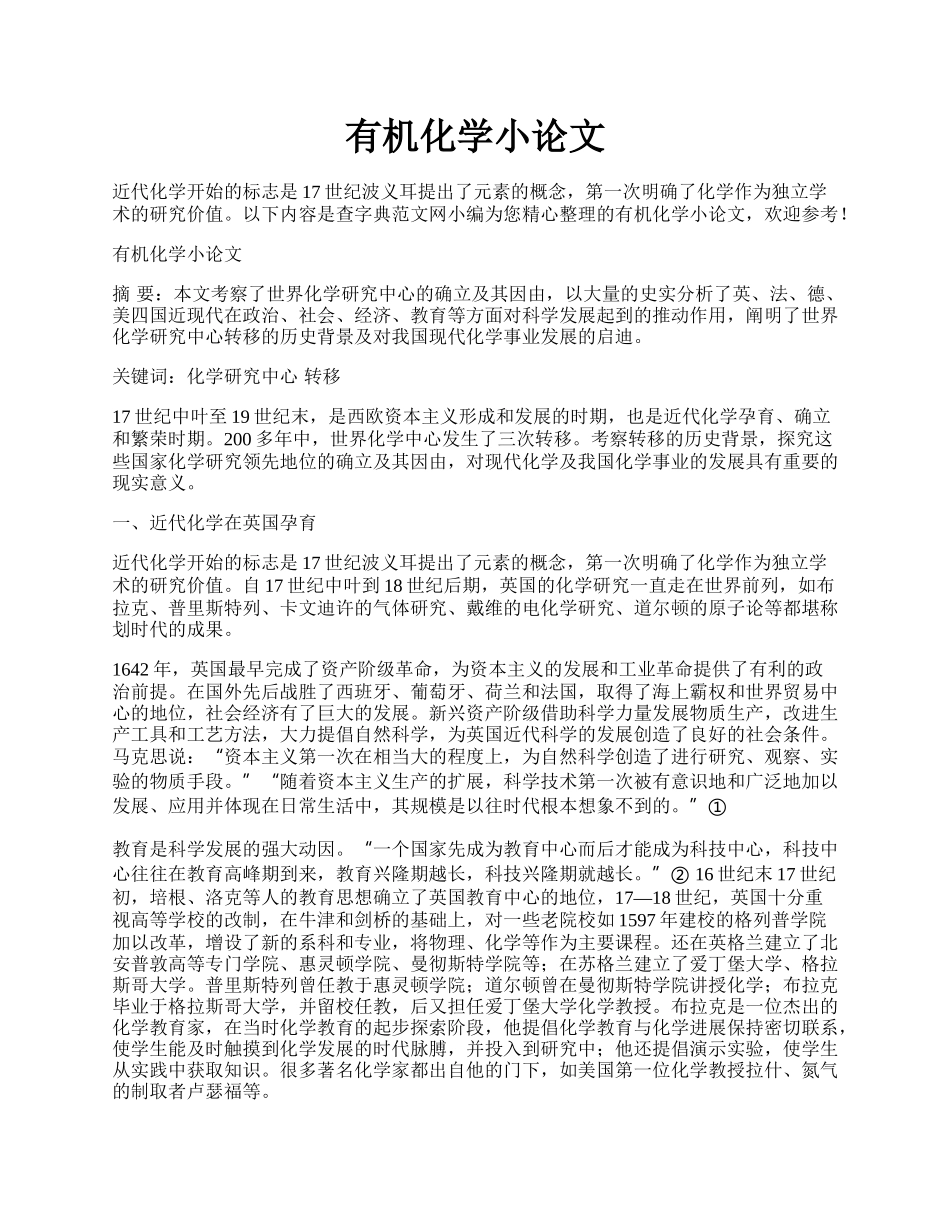 有机化学小论文近代化学开始的标志是17世纪波义耳提出了元素的概念,第一次明确了化学作为独立学术的研究价值。以下内容是查字典范文网小编为您精心整理的有机化学小论文,欢迎参考!有机化学小论文摘要:本文考...