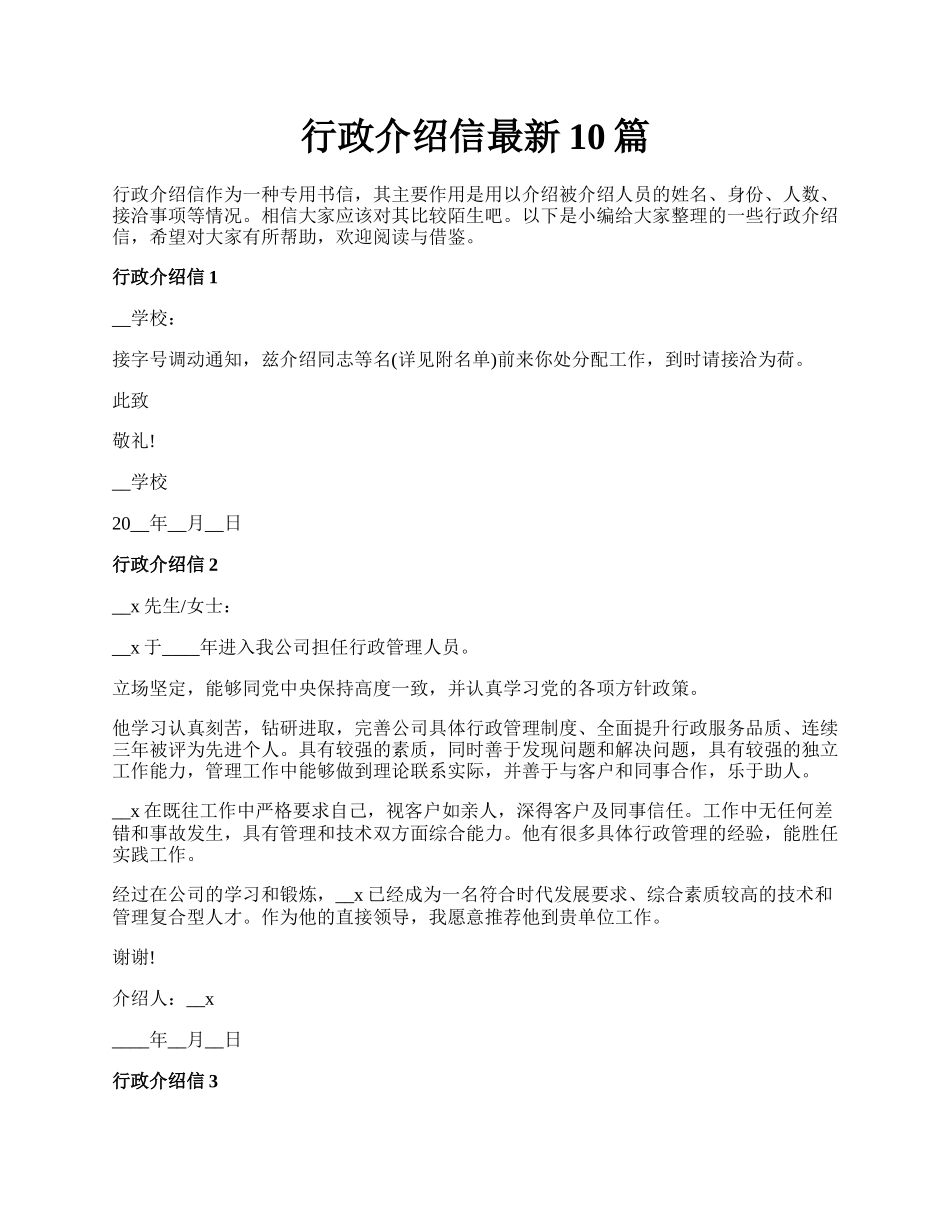 行政介绍信最新10篇行政介绍信作为一种专用书信,其主要作用是用以介绍被介绍人员的姓名、身份、人数、接洽事项等情况。相信大家应该对其比较陌生吧。以下是小编给大家整理的一些行政介绍信,希望对大家有所帮助...
