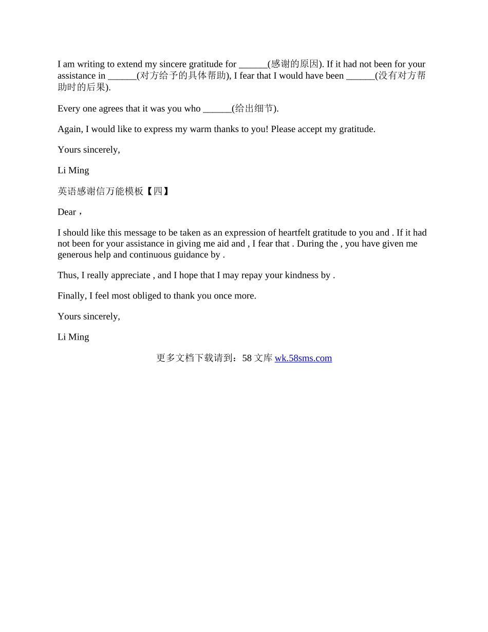 英语感谢信万能模板4篇不知道你们是不是在找关于英语感谢信万能模板呢?下面小编整理了4篇英语感谢信万能模板,供大家参考,希望对你们有帮助。英语感谢信万能模板【一】Dear_________,Iamwritingthislettertoexpr...