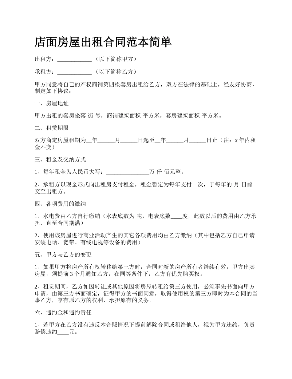 店面房屋出租合同范本简单出租方:____________(以下简称甲方)承租方:____________(以下简称乙方)甲方同意将自己的产权商铺第四楼套房出租给乙方,双方在法律的基础上,经友好协商,制定如下协议:一、房屋...