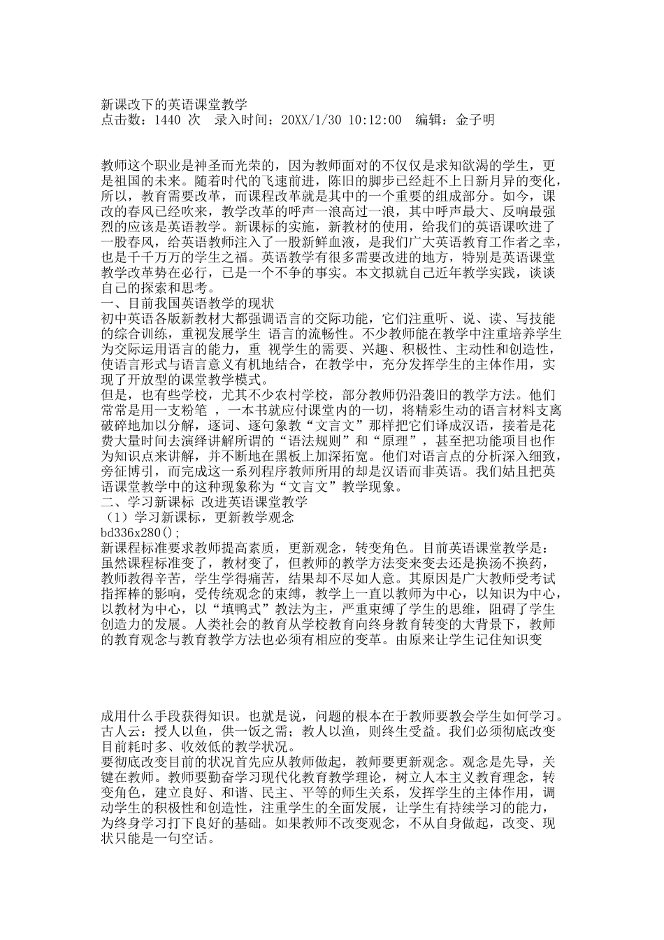 新课改下的英语课堂教学点击数:1440次录入时间:20XX/1/3010:12:00编辑:金子明教师这个职业是神圣而光荣的,因为教师面对的不仅仅是求知欲渴的学生,更是祖国的未来。随着时代的飞速前进,陈旧的脚步已经赶不上...