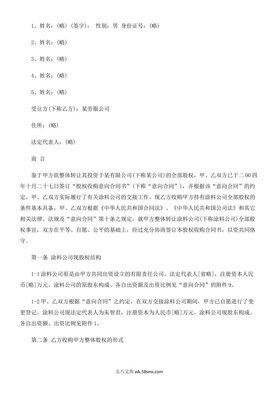 公司转让-股权收购合同书范本转让方:受让方:目录前言2第一条某公司现股权结构2第二条乙方收购甲方整体股权的形式3第三条甲方整体转让股权的价格3第四条价款支付方式3第五条资产交接后续协助事项4第六条清产核资...