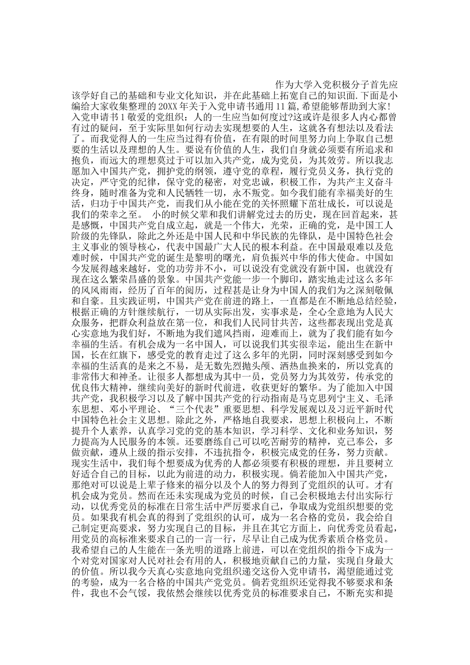 作为大学入党积极分子首先应该学好自己的基础和专业文化知识,并在此基础上拓宽自己的知识面.下面是小编给大家收集整理的20XX年关于入党申请书通用11篇,希望能够帮助到大家!入党申请书1敬爱的党组织:人的一生应...