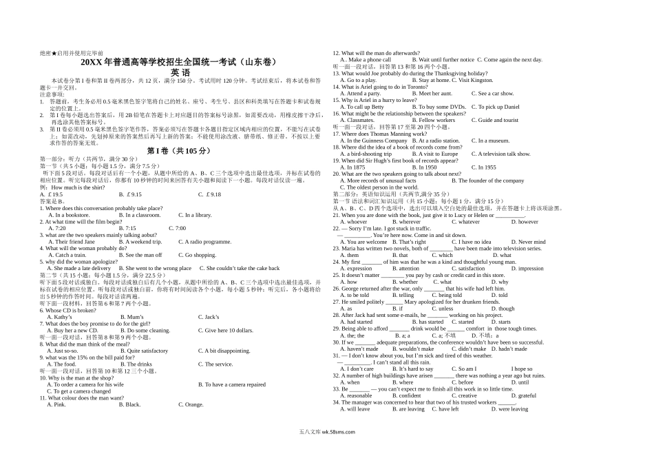 绝密★启用并使用完毕前20XX年普通高等学校招生全国统一考试(山东卷)英语本试卷分第I卷和第II卷两部分,共12页,满分150分。考试用时120分钟。考试结束后,将本试卷和答题卡一并交回。注意事项:1.答题前,考生...