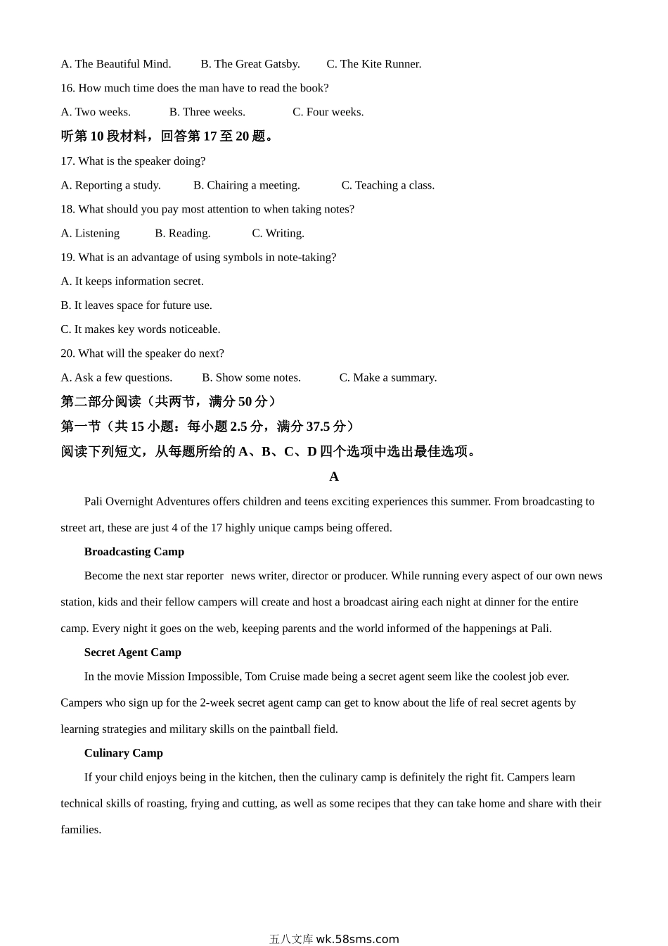 20XX年普通高等学校招生全国统一考试英语试题注意事项:1.答卷前,考生务必将自己的姓名、准考证号填写在答题卡上。2.回答选择题时,选出每小题答案后,用铅笔把答题卡上对应题目的答案标号涂黑。如需改动,用橡...