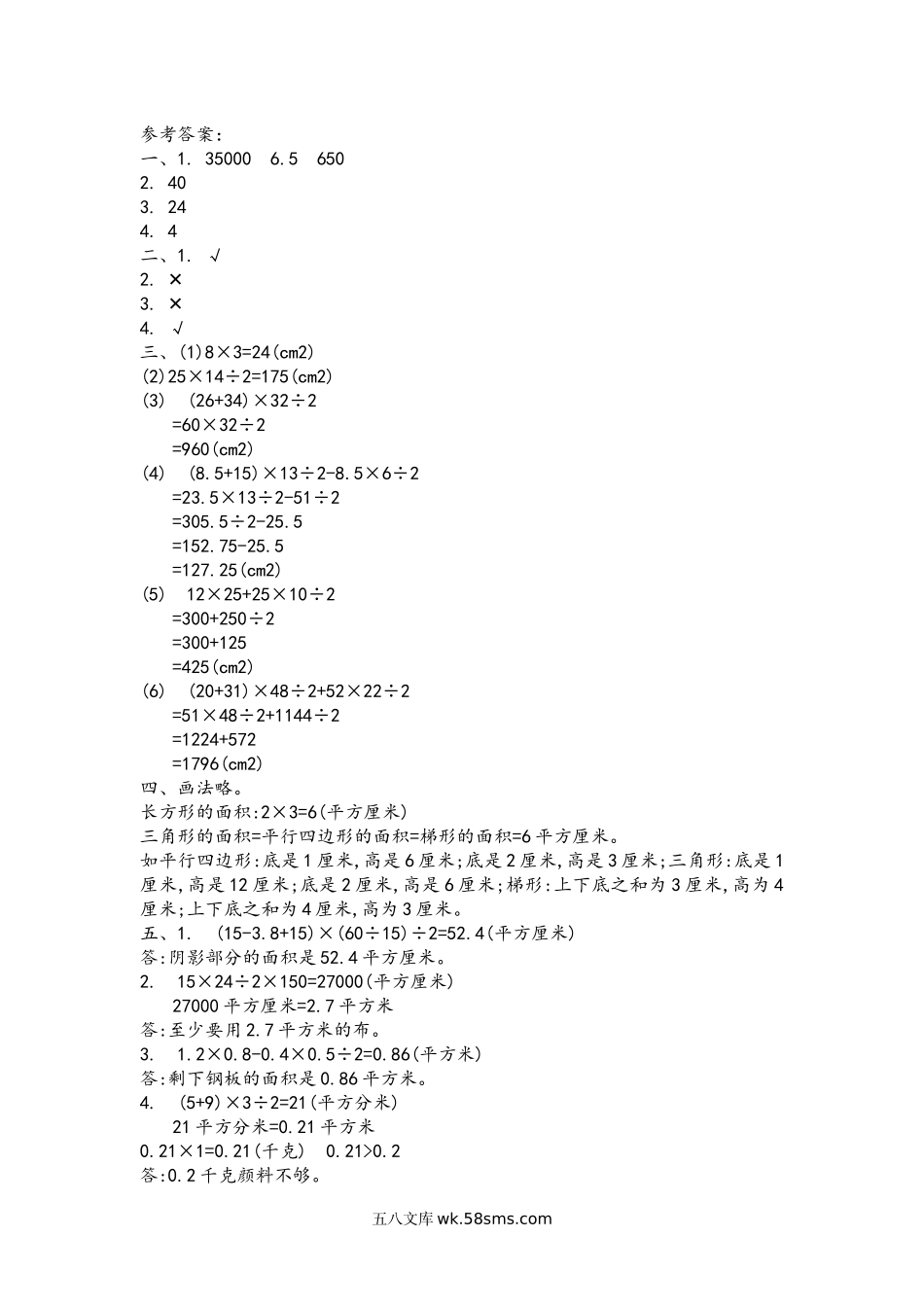 第五单元测试卷(三)时间:90分钟满分:100分分数:一、填空。(18分)1.3.5公顷=()平方米()平方千米=()公顷=6500000平方米2.两个完全相同的梯形可以拼成一个平行四边形,这个平行四边形的底是16厘米,高是5厘米,每个梯...