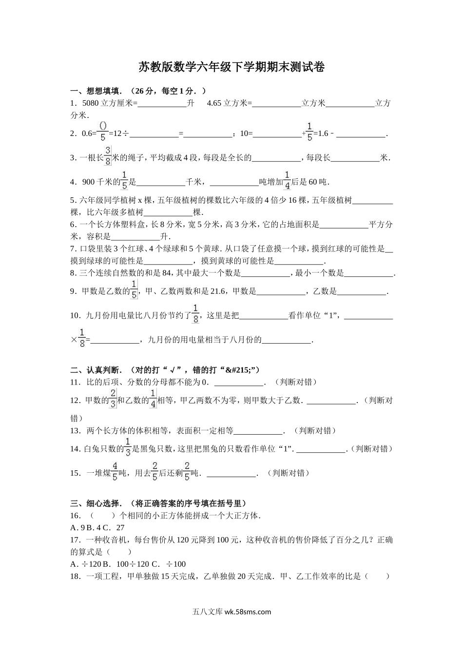 苏教版数学六年级下学期期末测试卷一、想想填填.(26分,每空1分.)1.5080立方厘米=升4.65立方米=立方米立方分米.2.0.6==12÷=:10=+=1.6﹣.3.一根长米的绳子,平均截成4段,每段是全长的,每段长米.4.9...