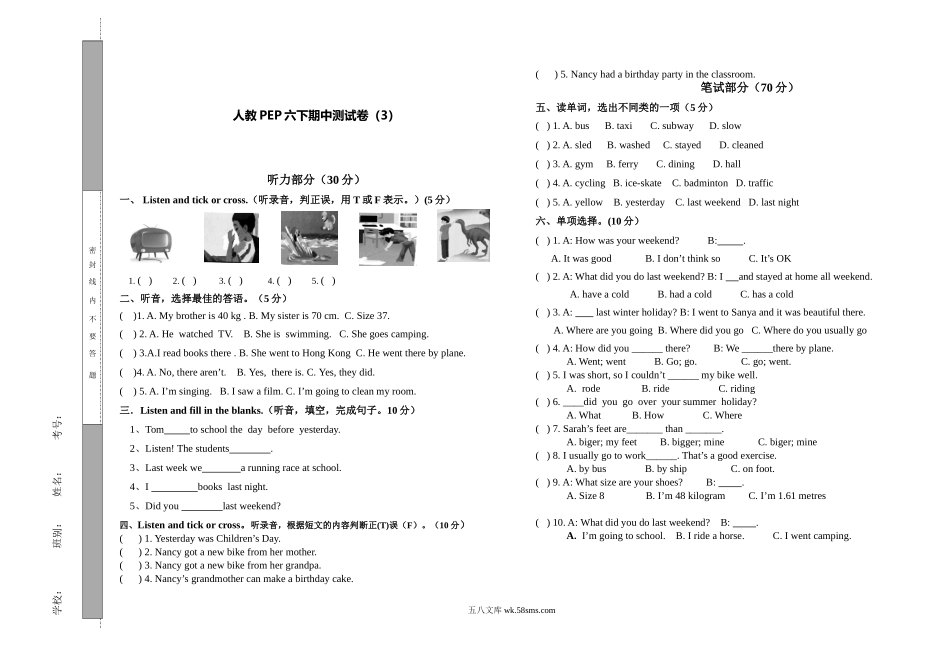 人教PEP六下期中测试卷(3)听力部分(30分)一、Listenandtickorcross.(听录音,判正误,用T或F表示。)(5分)1.()2.()3.()4.()5.()二、听音,选择最佳的答语。(5分)()1.A.Mybrotheris40kg.B.Mysisteris70cm....