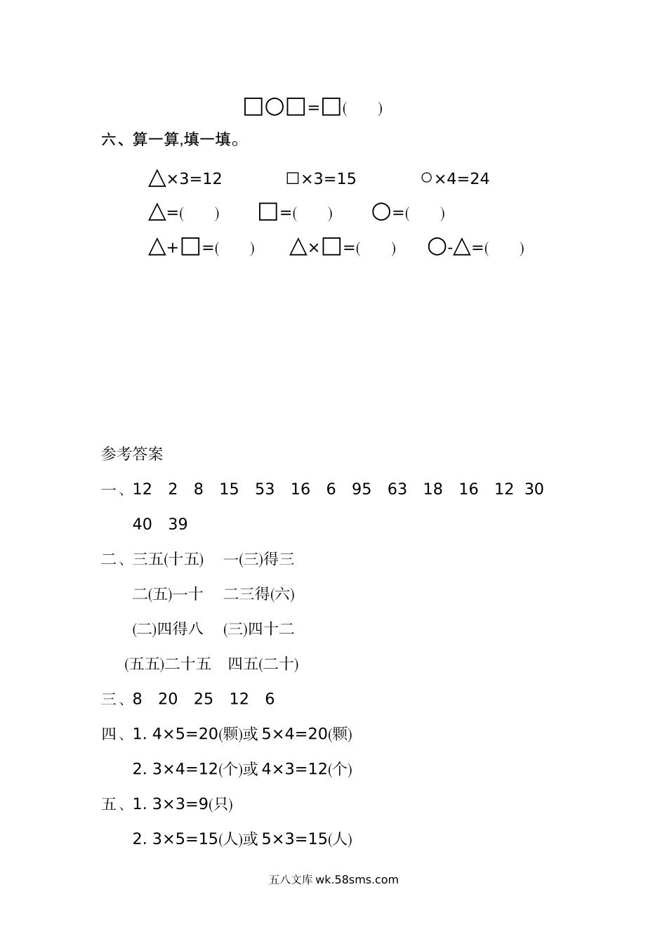 第五单元测试卷(二)一、口算。3×4=2×1=4+4=5×3=35+18=4×4=3×2=60+35=89-26=3×6=2×8=3×4=6×5=19+21=75-36=二、把乘法口诀补充完整。三五()一()得三二()一十二三得()()四得八()四十二()二十五四五()三、...