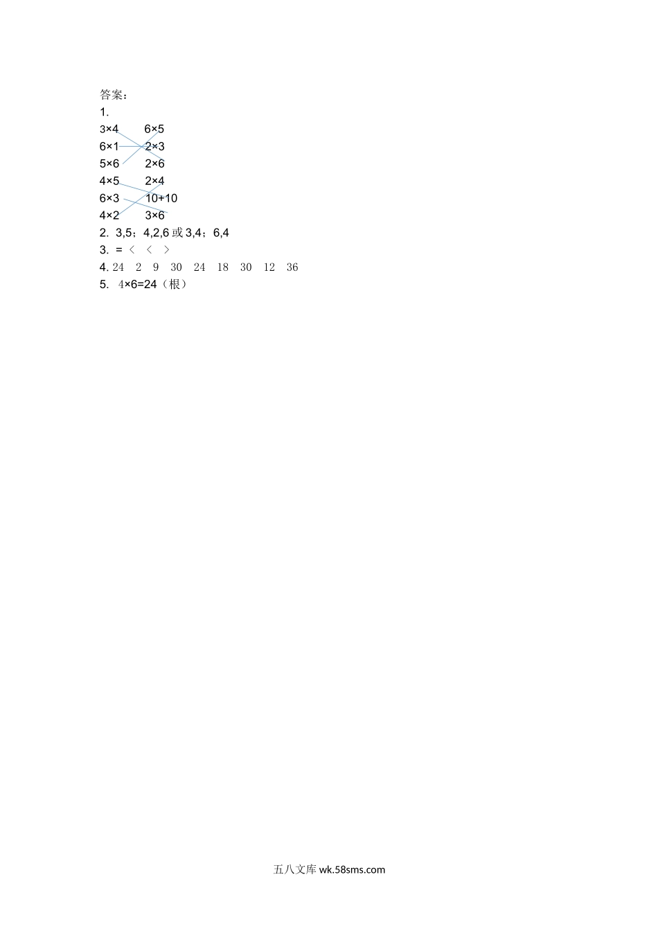 《有多少张贴画》课时练1.连一连3×46×56×12×35×62×64×52×46×310+104×23×62.在()里填上合适的数2×()=6()×5=25()×4=16()×()=123×()=186×()=243.比大小3×4⃝4×32×6⃝6×54+4⃝4...