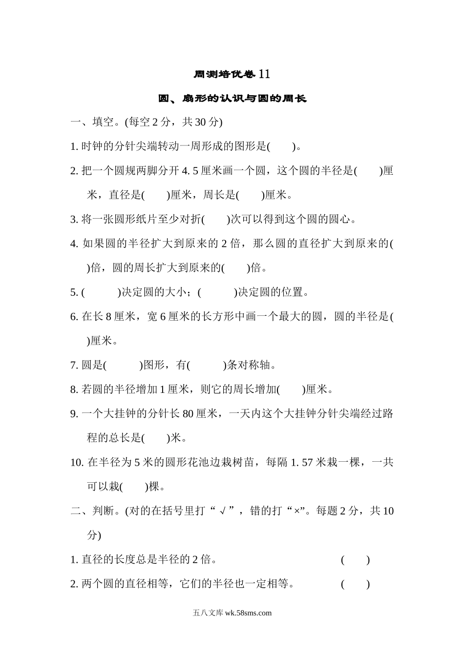 周测培优卷11圆、扇形的认识与圆的周长一、填空。(每空2分,共30分)1.时钟的分针尖端转动一周形成的图形是()。2.把一个圆规两脚分开4.5厘米画一个圆,这个圆的半径是()厘米,直径是()厘米,周长是()厘米。3.将一...