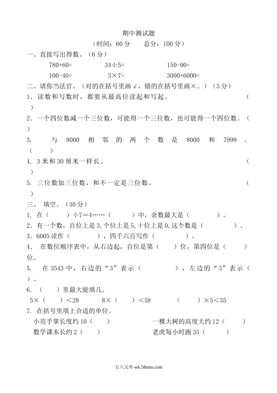期中测试题(时间:60分总分:100分)一、直接写出得数。(6分)780+60=34÷5=150-90=100-40=3×7=3000+6000=二、请你当法官。(对的在括号里画√,错的在括号里画×。)(5分)1.读数和写数时,都要从最高位读...