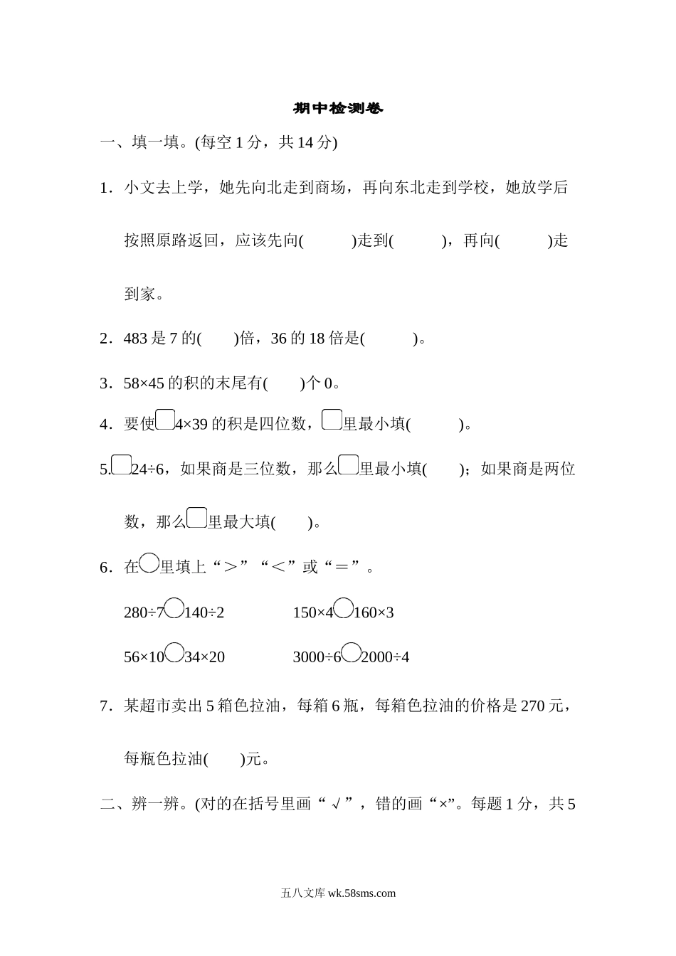 期中检测卷一、填一填。(每空1分,共14分)1.小文去上学,她先向北走到商场,再向东北走到学校,她放学后按照原路返回,应该先向()走到(),再向()走到家。2.483是7的()倍,36的18倍是()。3.58×45的积的末尾有(...