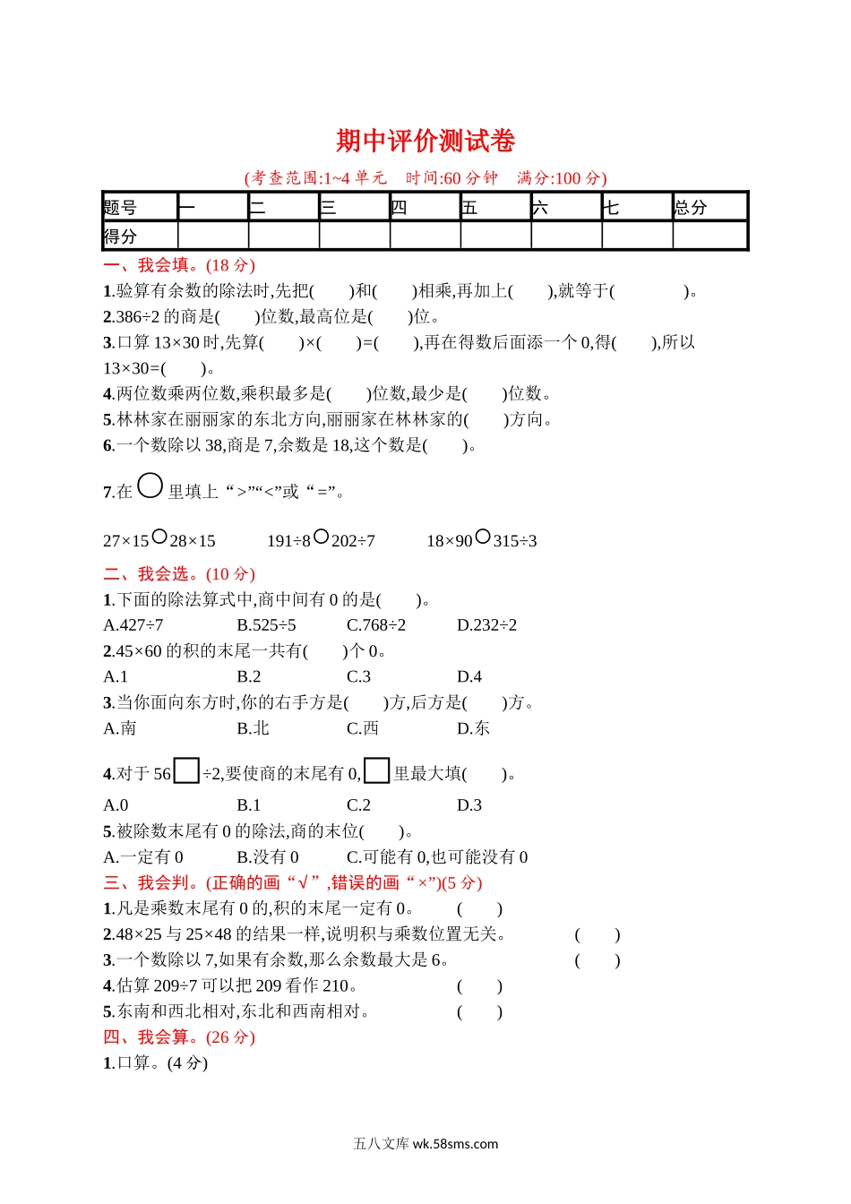 期中评价测试卷(考查范围:1~4单元时间:60分钟满分:100分)题号一二三四五六七总分得分一、我会填。(18分)1.验算有余数的除法时,先把()和()相乘,再加上(),就等于()。2.386÷2的商是()位数,最高位是()位。3.口算13×...