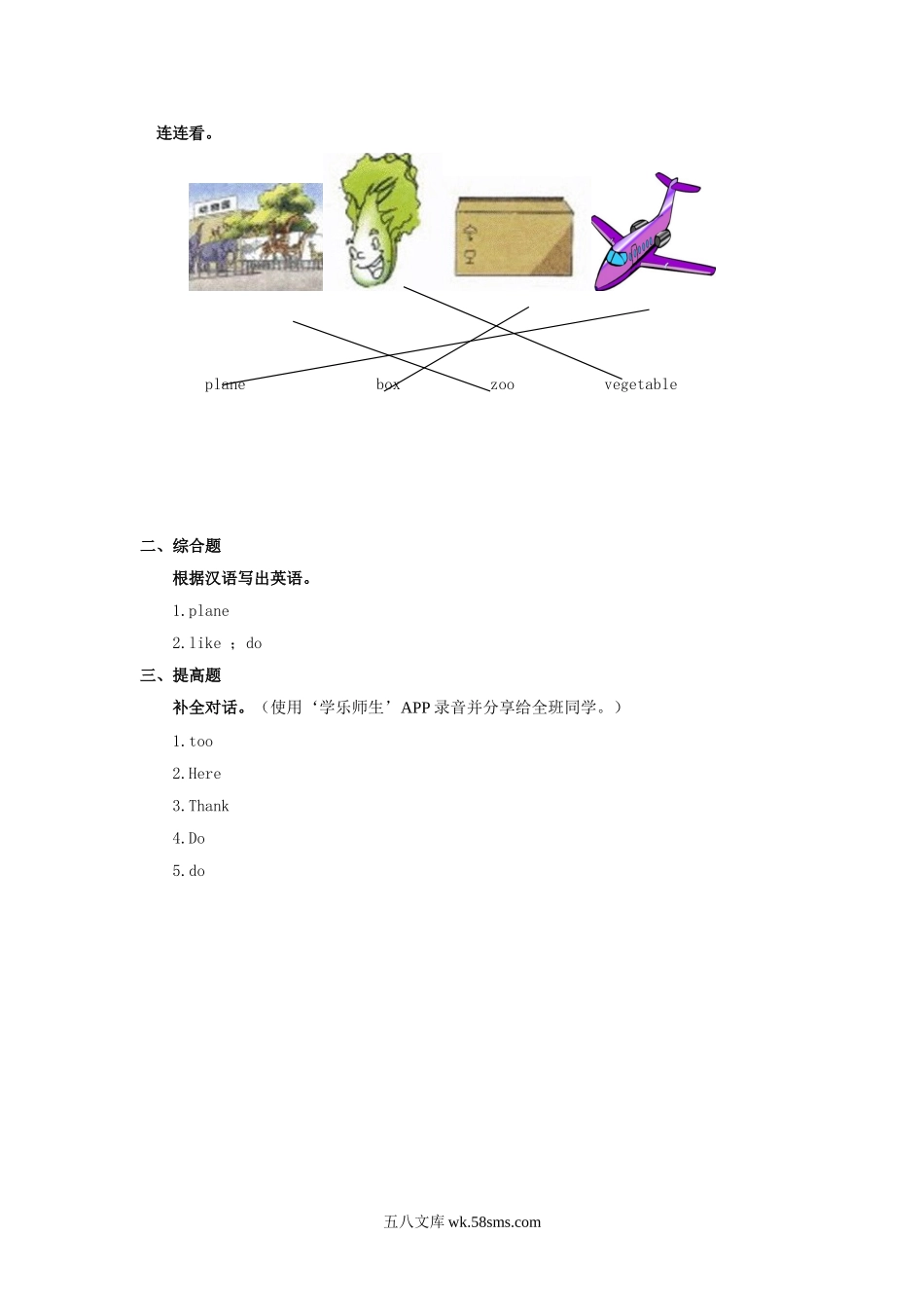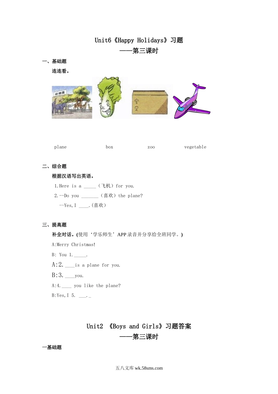 Unit6《HappyHolidays》习题——第三课时一、基础题连连看。planeboxzoovegetable二、综合题根据汉语写出英语。1.Hereisa_____(飞机)foryou.2.--Doyou_______(喜欢)theplane?--Yes,I____.(喜欢)三、提高题补...