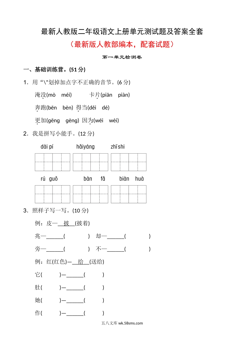 最新人教版二年级语文上册单元测试题及答案全套(最新版人教部编本,配套试题)第一单元检测卷一、基础训练营。(51分)1.用“\”划掉加点字不正确的音节。(6分)淹没(mòméi)卡片(piānpiàn)奔跑(bēnbèn)得当(...