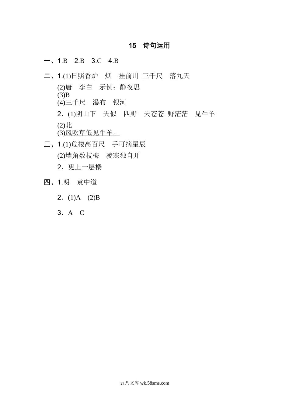 15诗句运用班级__________姓名__________得分__________时间:40分钟满分:100分1.《登鹳雀楼》的作者是唐代著名诗人()。A.王维B.王之涣C.白居易2.《梅花》的作者是()代著名诗人王安石。A.唐B.宋C.清3....